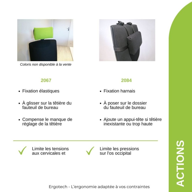 This removable and adjustable headrest for office chairs also serves as a neck and cervical support. It helps reduce neck pain at work and is available with two attachment systems to fit chairs with or without a headrest.