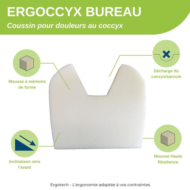 The Ergoccyx chair cushion relieves pressure on the coccyx and sacrum while sitting, thanks to its large coccyx and sacrum cut-out. Thicker at the back (7 cm vs. 4 cm at the front), it promotes a dynamic sitting posture. Recommended for coccyx pain, coccyx fracture, and related conditions.