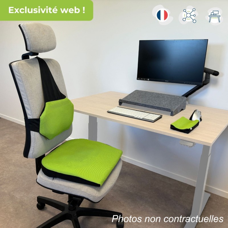 Enhance your comfort with our ergonomic cushions and optimize your workstation with this complete kit (seat cushion, lumbar support, vertical mouse, monitor arm, document holder, etc.).