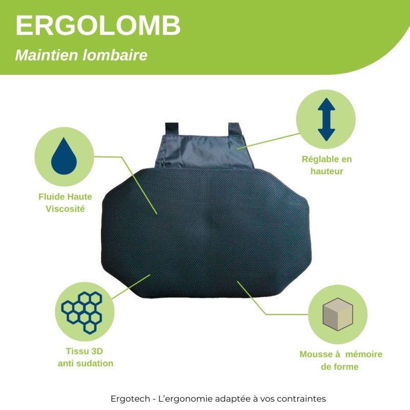 • Supports the lumbar region: thanks to the High Viscosity fluid, the Ergolomb adapts to the natural curvature of the back, unlike other models whose shape and thickness can create constraint and discomfort on the lumbar region.