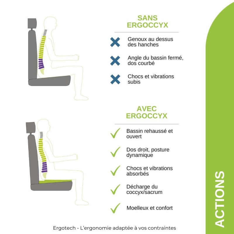 Ergoccyx for Vehicles is an ergonomic seating cushion specifically designed to relieve back pain while driving and adapted for conditions like sciatica, herniated discs, or vertebral compression. To relieve back pain during car rides, Ergoccyx Vehicle acts in several ways: