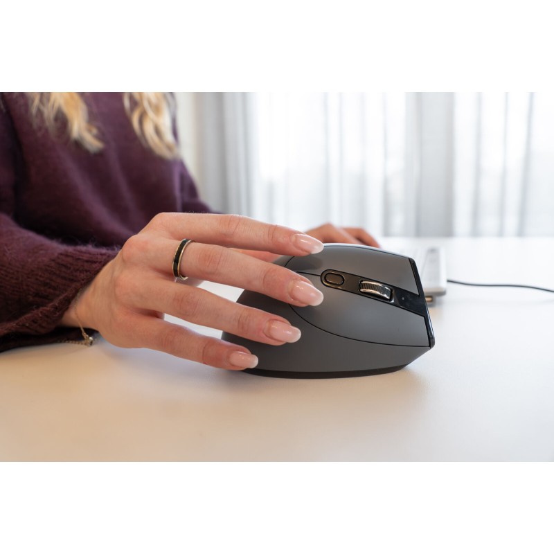 A vertical mouse places the arm back into a natural, less constrained posture. This reduces discomfort and pain, and improves working comfort.
